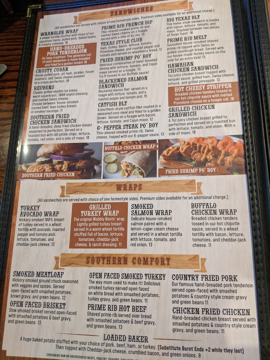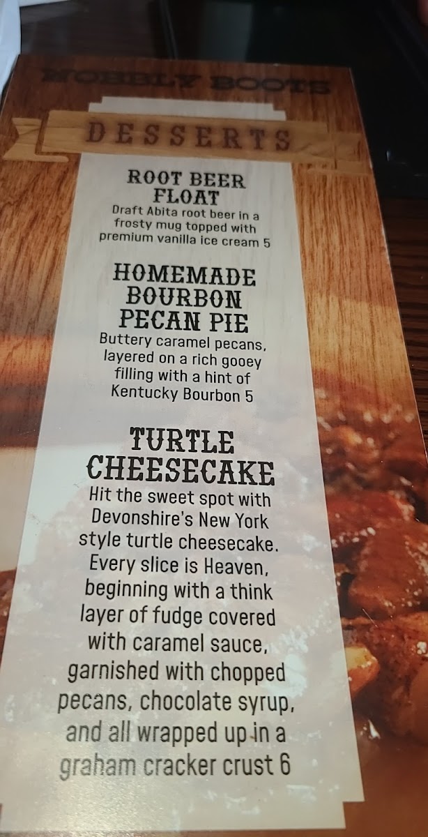 The menu also offers tasty options for kids, such as the Kid Burger and Kid Tenders, all served with homestyle sides. Diners rave about the Brown Sugar Salmon, elegantly paired with smashed potatoes. Don't miss their decadent desserts, like the mouthwatering turtle cheesecake, which adds a sweet conclusion to any meal. With fantastic service and generous portions, Wobbly Boots Roadhouse is a must-visit culinary gem.